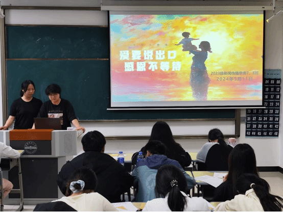 “同學們,猜一猜明天是什么節日???”“母親節!”5月11日,新聞傳播學類專業2023(7)、(8)班在K202教室開展以“愛要說出口,感恩不等待”為主題的團建活動?;顒娱_始前,活動負責人、新聞傳播學類專業2023(7)、(8)班的班長楊雨霏、朱研溪提前為每位同學準備好信紙和信封。朱研溪說:“我們希望通過寫信這種傳統而深情的溝通方式,讓同學們勇敢表達自己的心聲,將對母親的愛訴說于筆尖。”學生們觀看一段關于母愛的感人短片后,...